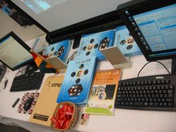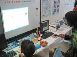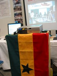 | 展示ブースのテーブル上には、2台のパソコン、宣伝用パンフ などを置きました。ガーナ・チョコレート(ロッテ)も用意 しましたが、意外と持っていく人は少なかった…。 | 液晶プロジェクターからは、授業実践ビデオも投影できるよう にしました。段ボール箱を積み上げて投影距離を確保、さらに 見栄えを良くするためガーナ国旗をかぶせました。 |