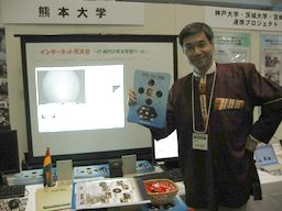 | うちの松山院生に加え、千葉大教育学部から有賀さん(三年生) にお手伝いしてもらいました。二人ともガーナ服を着せられて います。後方のスクリーンに映っているのは、熊大天文台からの リアルタイム太陽映像。 | 私もガーナ服(附属小での実践と同じ)を着て、二日間の展示を 過ごしました。 |
