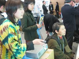 | レーザーポインターでスクリーン上を指し示しながら、天文台の 操作(マウスのクリック手順など)を説明します。 | 有賀さんは今回の展示で初めてインターネット天文台に触れました が、操作に説明にと大活躍でした。嵐のような二日間(初日は実際、 大雪)が過ぎ、大成功の展示でした。 |