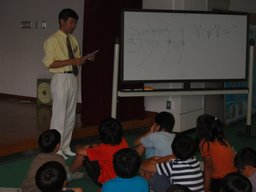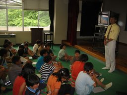 ←左 小学生相手でちょっと緊張!まずは自己紹介と、ちょっとだけ 金星探査計画のPRなど。場所は三階の一室。